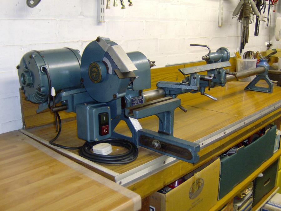 And not content with the two beauties above he has acquired a Coronet Minor and intends to sell it having completed a quality restoration and uprating. This Minor is date stamped 1967. As you can see the original vee pulleys have made way for the polyvee 4 speed ones. Colin also changed the way of adjusting the tool rests so now instead of using a spanner there are domed coach bolts so it can all be done with a turn of the handle. He would have preferred to have kept the original handles but doesn't think that the next owner is going to mind. And I think I agree with him despite being a Coronet purist at heart. For those with limited digit mobility or even lack of digits they are going to find it easier to use. He has also had a couple of round section tool rests made up though the originals are still available to go with the lathe. Now that is something I approve of as those rectangular rests are surprisingly poor by Coronet standards. They offer little in the way of support for woodturning chisels. Even a quadrant profile would be preferable as demonstrated in several turning guide books from the late 1960s. (I have one and will give the name when I find it again) The motor mounting has been modified by attaching a large hinge to allow easy belt changes and finally a new NVR switch has been added. The lathe itself is mounted on a 1 1/2" thick board at 4' long. All in all a great restoration with some quality uprating which even the purists couldn't disapprove of. Thanks Colin for sharing it with the Boleyn Workshops Readers Machines.